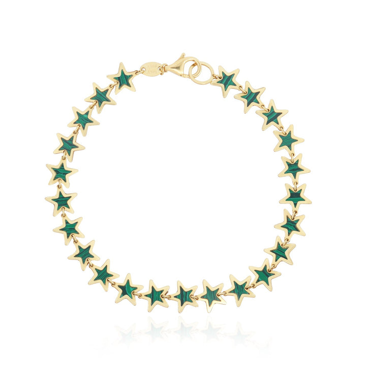 Handcrafted in 14k yellow gold, featuring 23 malachite stars (6mm each), measuring 7 inches in length with a lobster clasp.