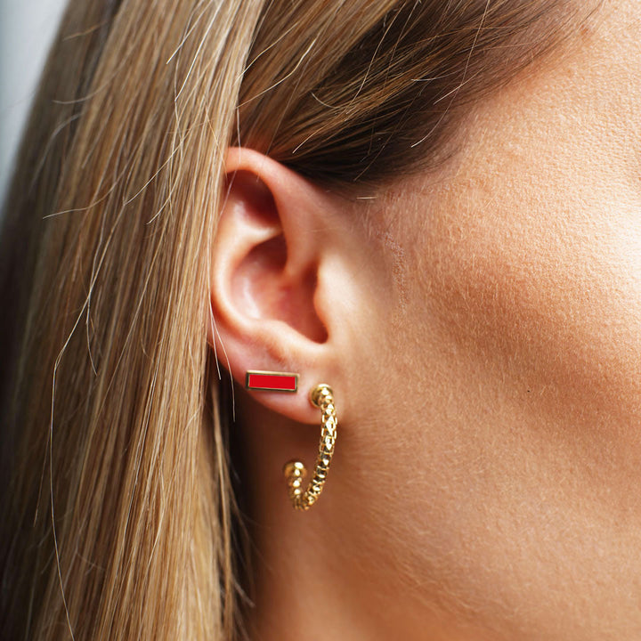 These Coral Bar Stud Earrings by The Lovery are an elegant and colorful addition to your jewelry collection. Crafted in 14K yellow gold, these earrings feature two coral bars, each measuring 3 x 10mm, making them a perfect combination of simplicity and vibrancy.