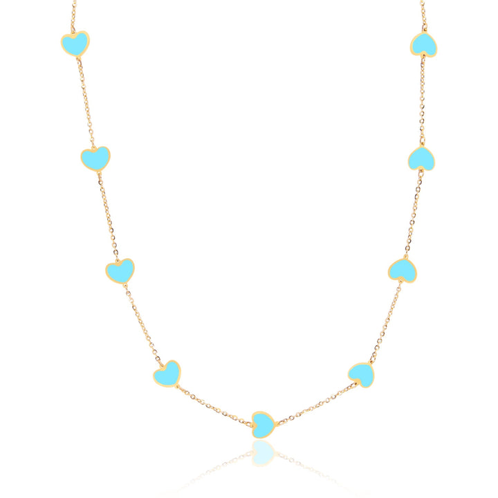 Handcrafted in 14K Yellow Gold with 9 Turquoise Hearts. Each heart measures 7 mm (0.25 inches). Adjustable chain length: 16-18 inches. Lobster clasp closure.