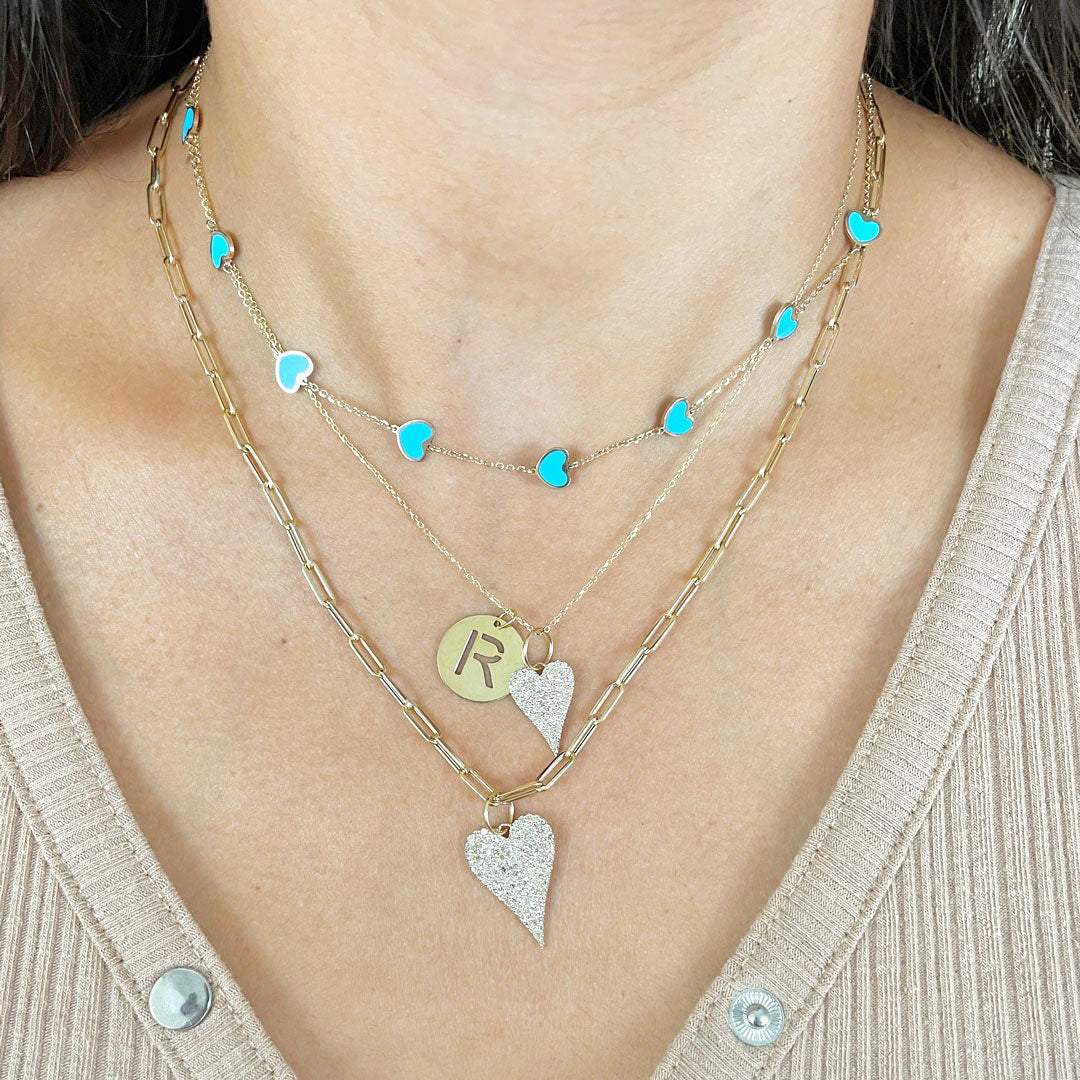 This Turquoise Heart Station Necklace by The Lovery offers a vibrant and colorful design, with 9 turquoise hearts set in 14K Yellow Gold. Perfect for adding a pop of color to your wardrobe, this necklace can be worn on its own or layered with other pieces for a chic, bohemian look. The adjustable chain ensures the perfect fit for any occasion.