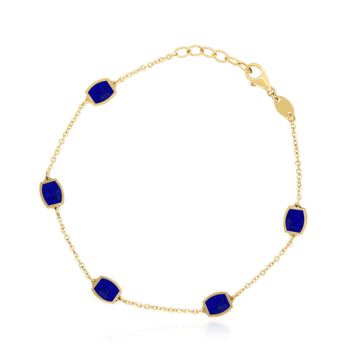 Handcrafted in 14k yellow gold, featuring 5 lapis icons (6 x 5mm each), adjustable chain length from 6.5 to 7 inches with a lobster clasp.