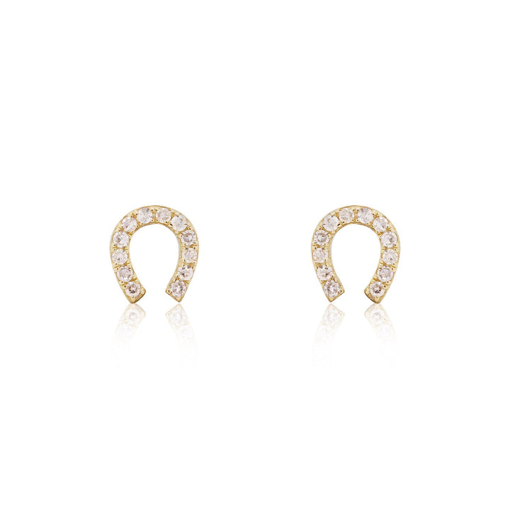 Made with 14K Yellow Gold, 24 round brilliant white diamonds (0.15 ct total weight, H-I color, SI clarity). Earring style: Stud. Horseshoe measures: 6 x 7mm.