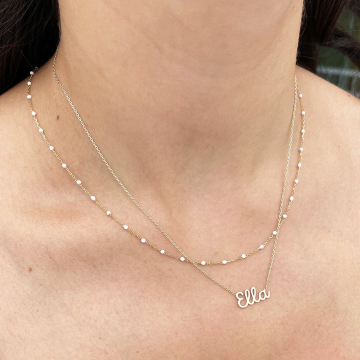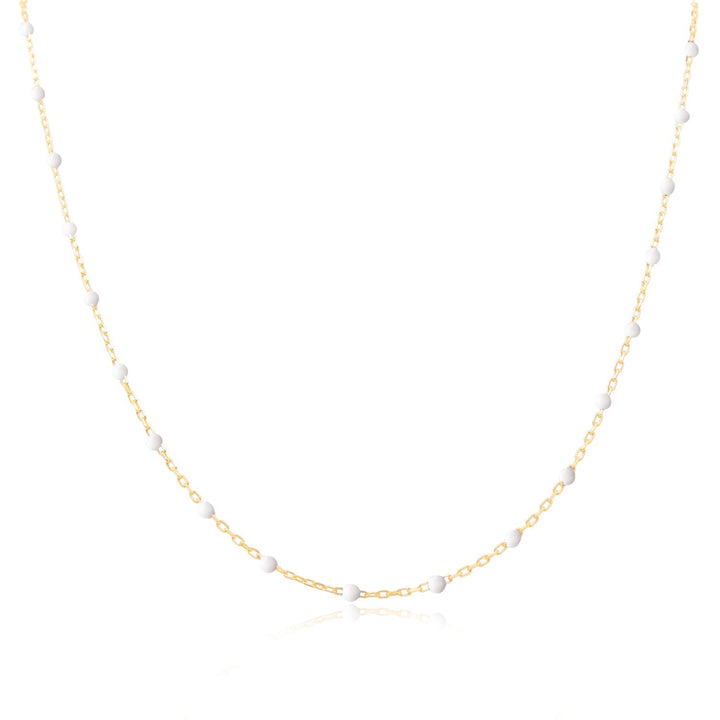 This White Bead Chain Necklace 16 Inches by The Lovery is a classic and versatile piece, featuring white enamel beads set in 14K yellow gold. This delicate necklace can be worn on its own or layered with your favorite charms for a more personalized look.