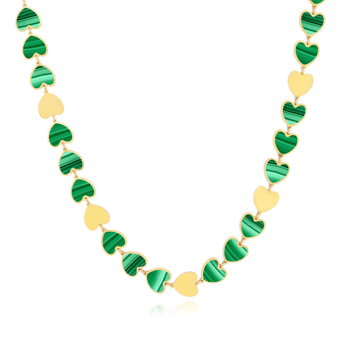 14K yellow gold. 39 malachite hearts and 13 gold heart shapes (each heart measures 7mm, 0.25 inches). Adjustable chain length (16-18 inches). Lobster clasp.
