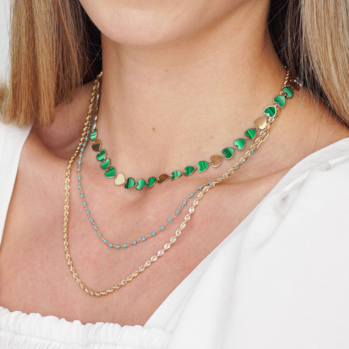 This Malachite and Gold Heart Necklace by The Lovery is a stunning and colorful piece that adds a vibrant touch to your jewelry collection. Featuring malachite hearts and gold heart shapes, this necklace can be worn alone or layered for a bold statement. The adjustable chain allows for versatile styling, making it a perfect addition to any wardrobe.