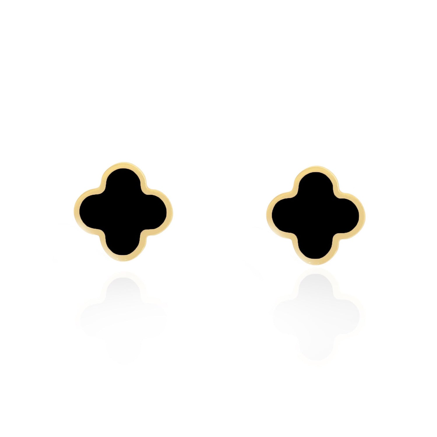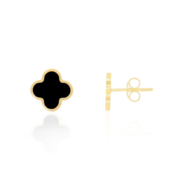Made with 14K yellow gold and onyx. Earring style: Stud. Clover measures: 10mm.