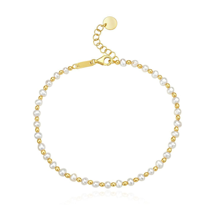 This Pearl and Gold Bead Bracelet by The Lovery adds a touch of elegance to any outfit, with its combination of freshwater pearls and gold beads. The simple design makes it ideal for layering or wearing on its own. Whether paired with other bracelets or worn solo, this piece is a timeless addition to your collection.