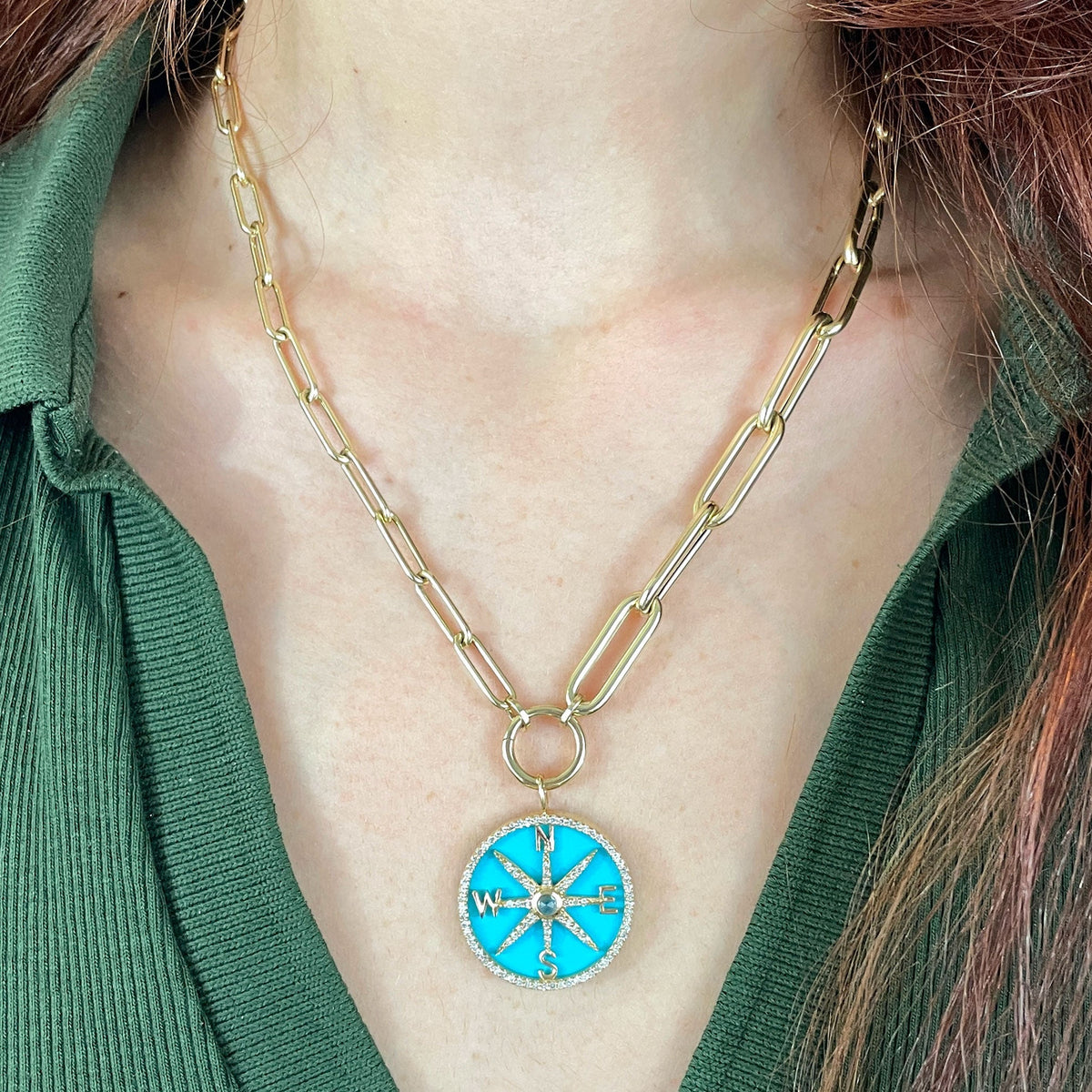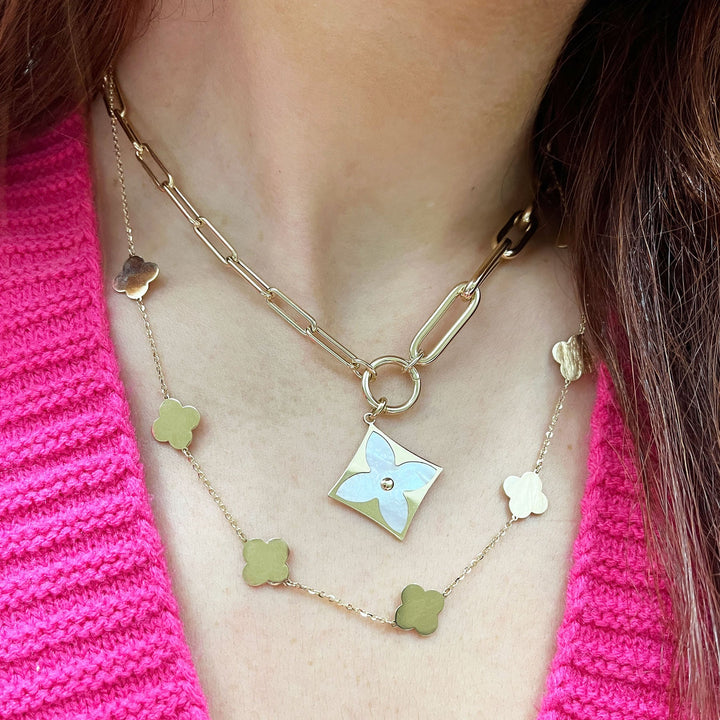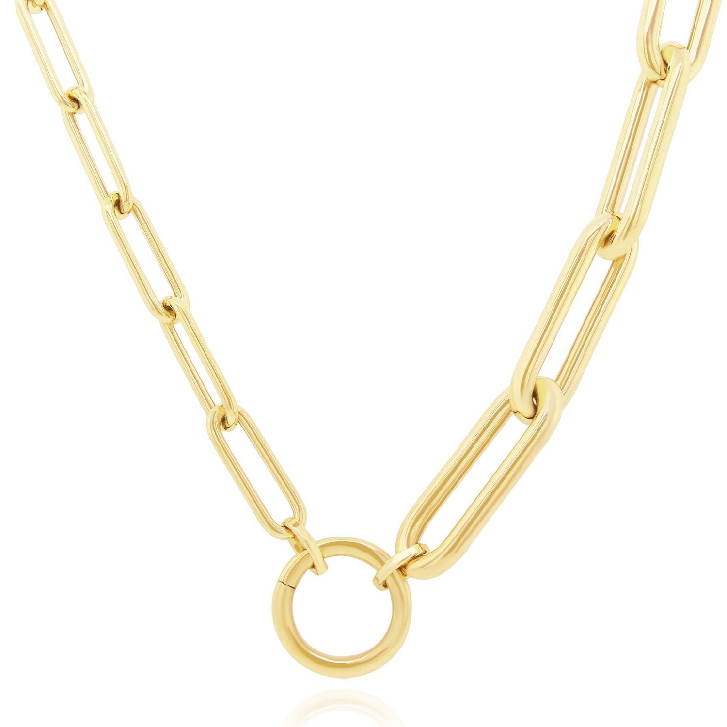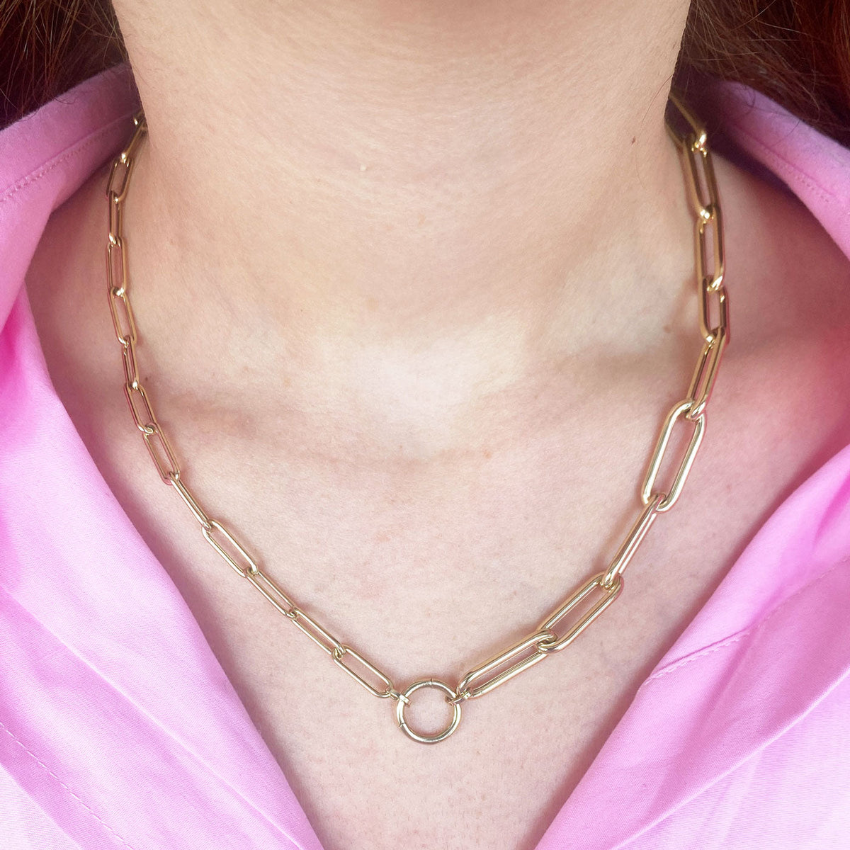 This Half & Half Paperclip Charm Holder Chain Necklace by The Lovery features a unique twist on the classic paperclip design. The round centerpiece can be opened to hang your favorite charms, making it a versatile and personalized piece. Perfect for adding a unique touch to any collection.