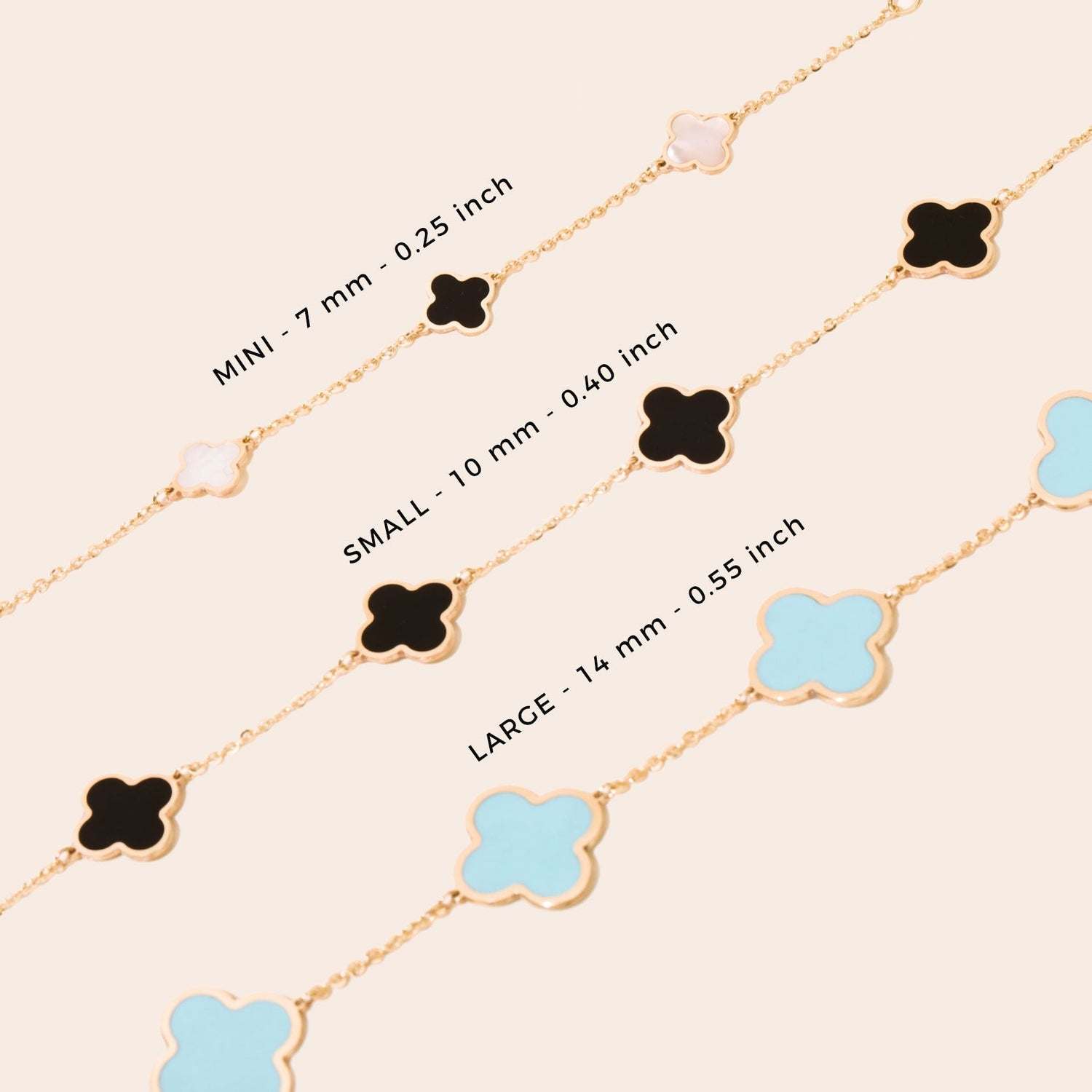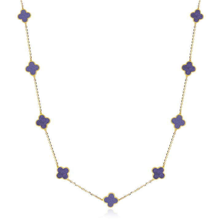 14K yellow gold, 9 amethyst clovers (7mm each). Adjustable chain length (16-18 inches). Lobster clasp.