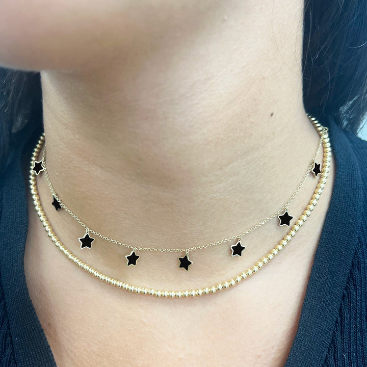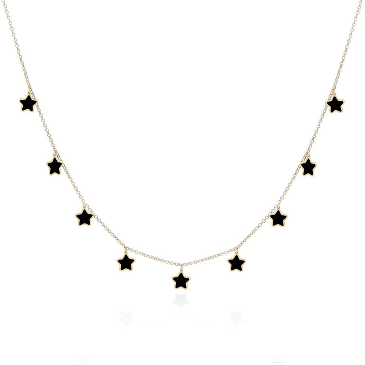 Handcrafted in 14K Yellow Gold with 9 Onyx Stars. Each star measures 7 mm (0.25 inches). Adjustable chain length: 16-18 inches. Lobster clasp closure.