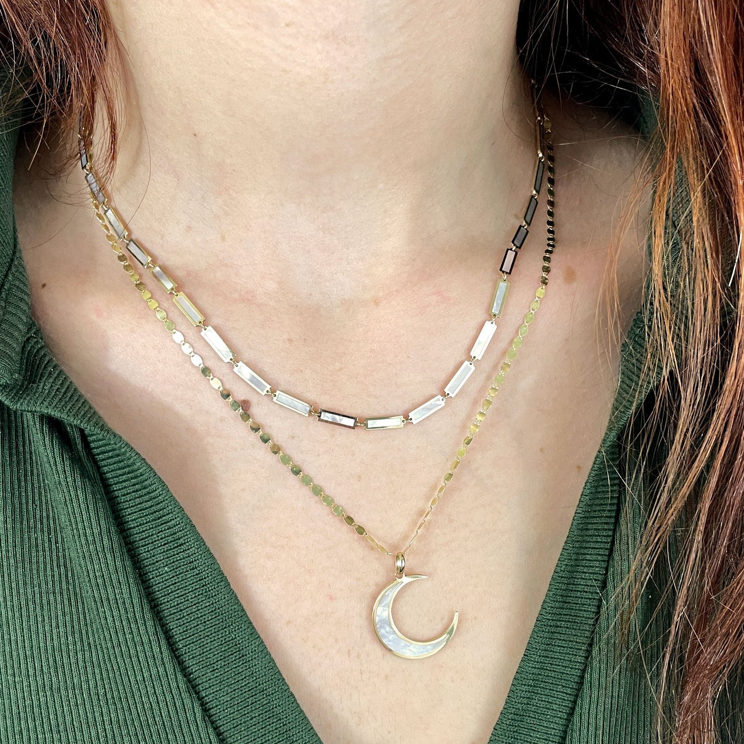 14K yellow gold. 36+ mother of pearl bars (each 2 x 9mm, 0.07 x 0.35 inches). 16-inch chain length. Lobster clasp.