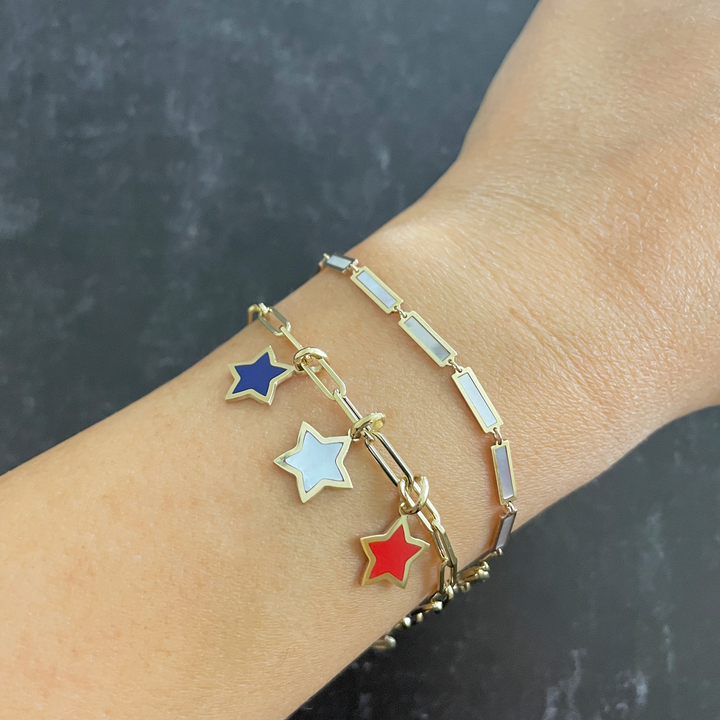 This Mother Of Pearl Star Charm 13mm by The Lovery adds a celestial touch to any jewelry collection. Crafted in 14K yellow gold, this star-shaped charm features a beautiful mother of pearl stone that sparkles with natural elegance. Identical on both sides, this charm is perfect for adding to necklaces, bracelets, or earrings.