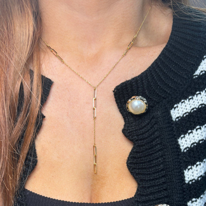 This Paperclip Lariat Necklace by The Lovery is a modern and stylish piece with a gemstone lariat drop. Whether dressed up with cocktail attire or down with casual wear, this necklace adds an elegant and chic touch to any look. The adjustable length and the lariat design give this necklace a versatile edge for various styling options.
