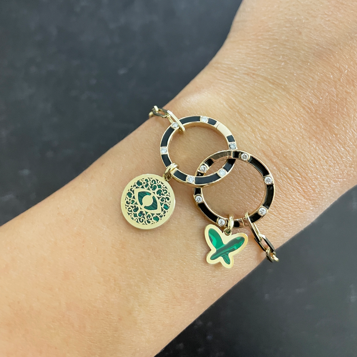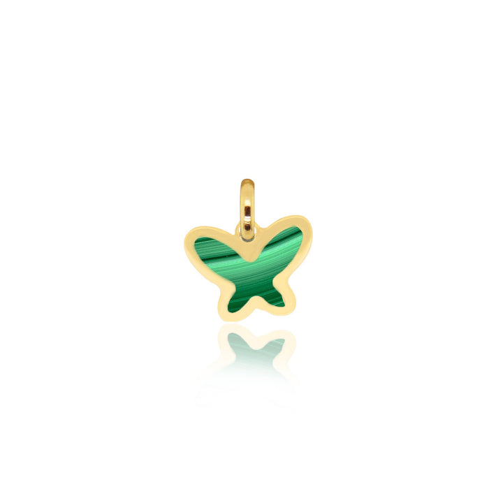 This Malachite Butterfly Charm 15mm by The Lovery offers a larger version of the butterfly charm, perfect for those who want a more striking design. The 14K yellow gold butterfly is set with malachite, creating a beautiful contrast of colors. The charm is identical on both sides, allowing for versatile wear.