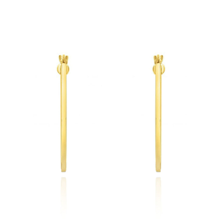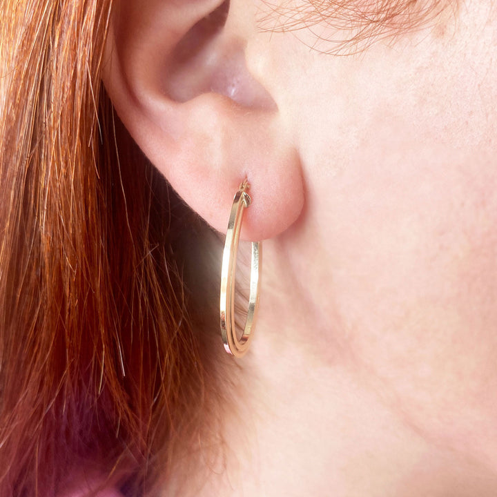 These Gold Oval Hoop Earrings by The Lovery are a must-have in every jewelry collection. Crafted in 14K yellow gold, these classic hoops measure 28mm long by 15mm wide, making them versatile enough for both casual and formal occasions.