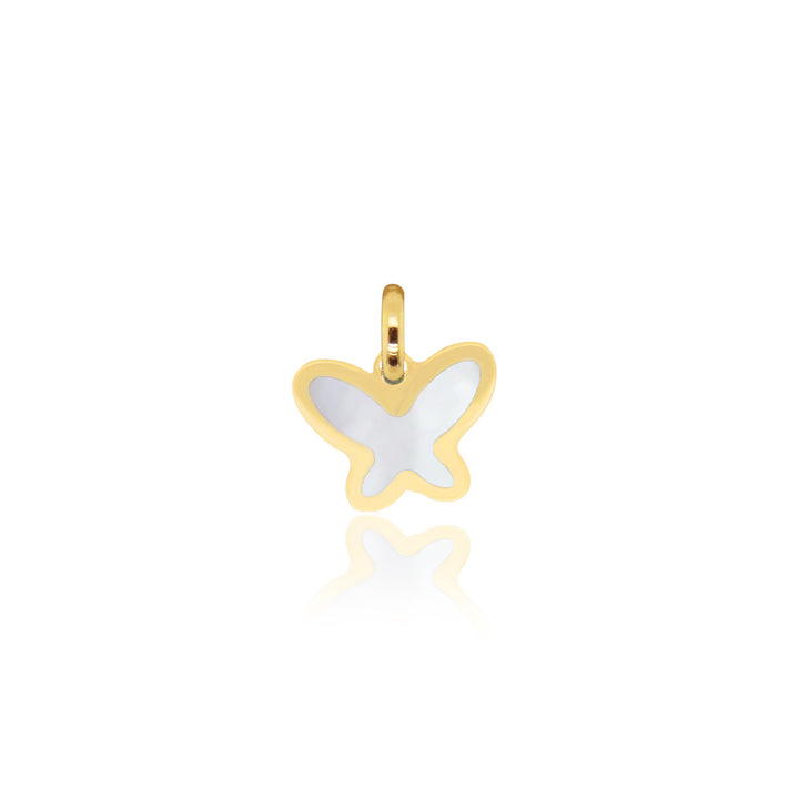 This Mother Of Pearl Butterfly Charm 11mm by The Lovery is a smaller version of the same charming butterfly design, perfect for adding a delicate touch to any chain or bracelet. Crafted in 14K yellow gold, this charm features a lovely mother of pearl stone, identical on both sides for versatile wear.