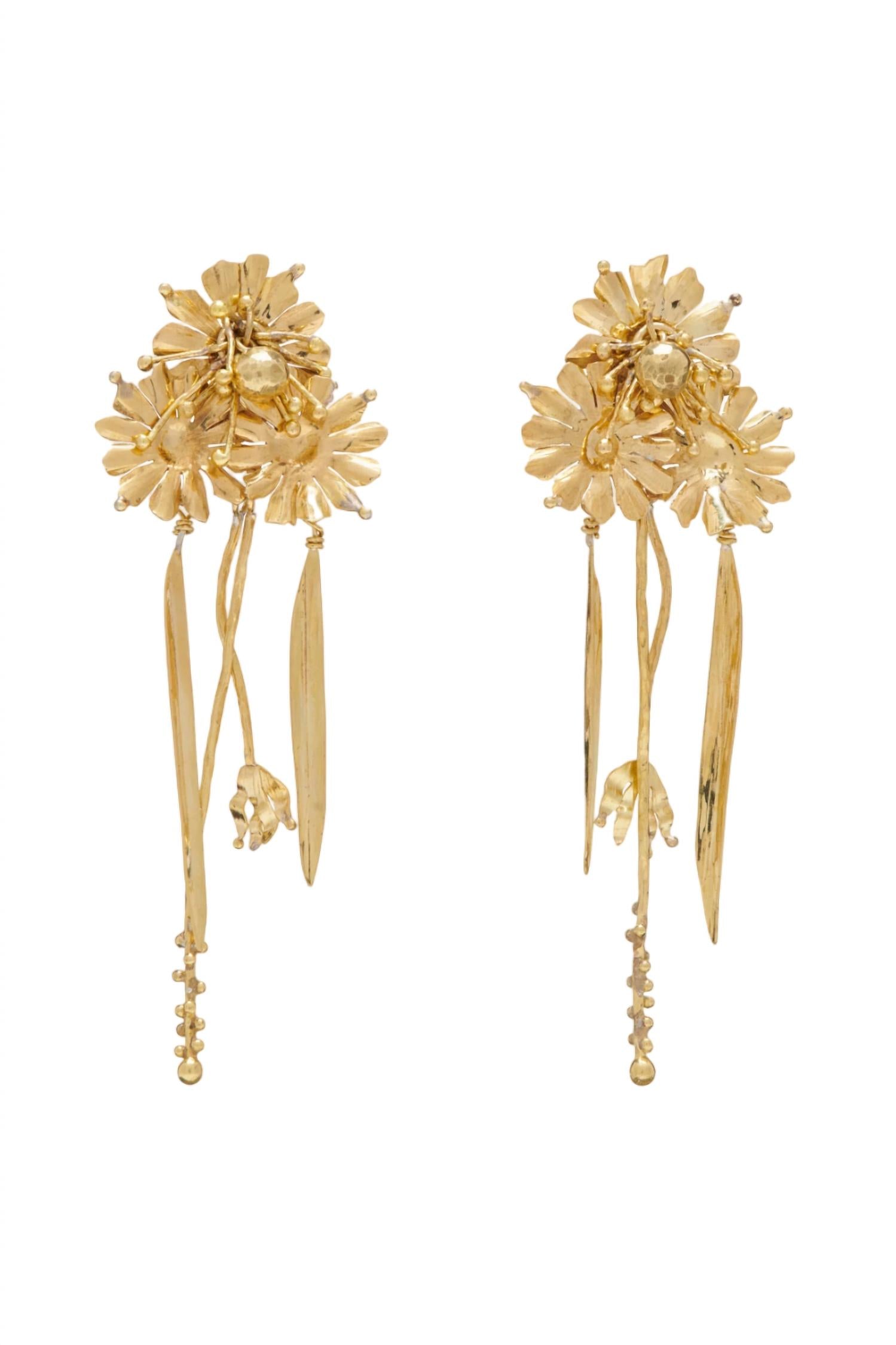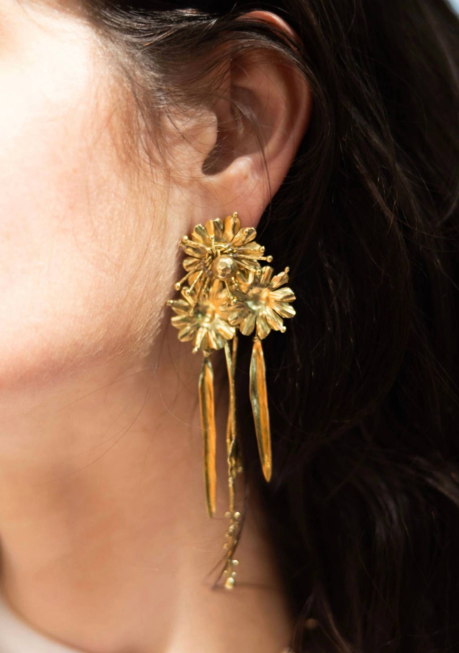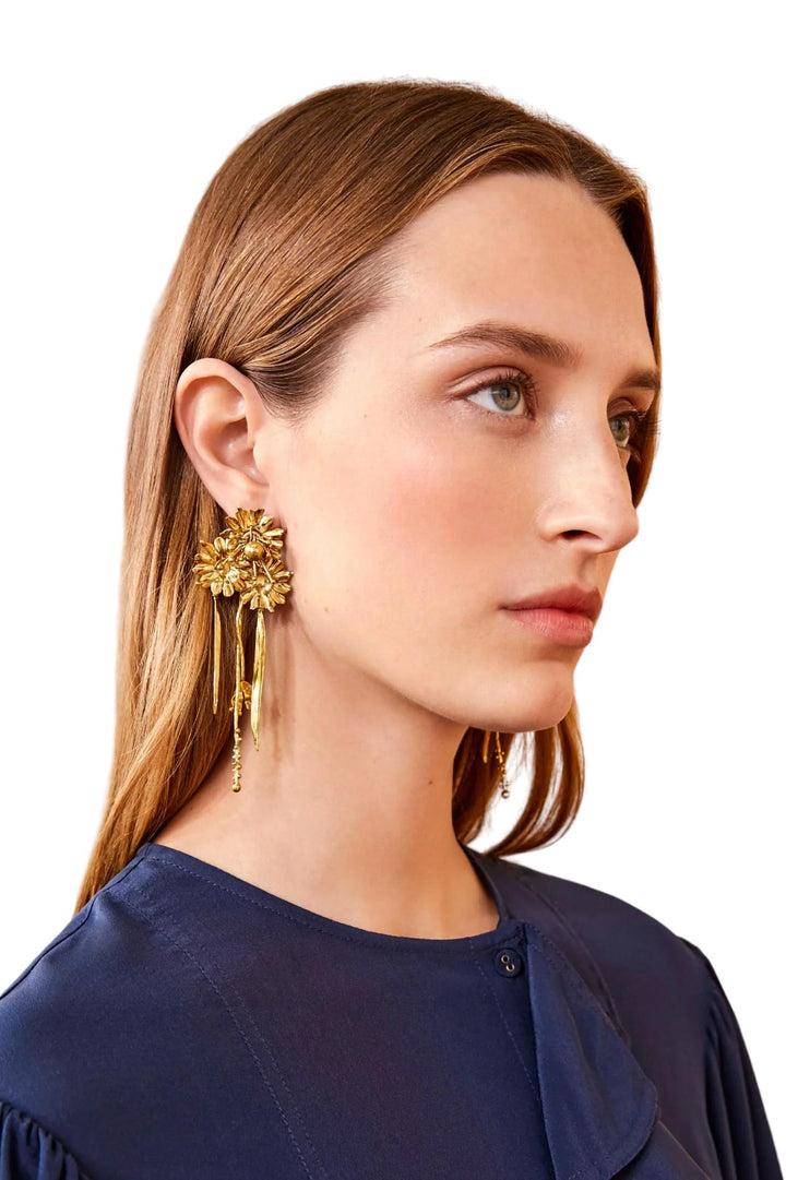 These Zayin Earrings in Brass by Ulla Johnson feature blooming flower petals and pom-poms that resemble a flower's stamen. Crafted with gold-filled wire and hypoallergenic stainless steel posts, these earrings are both elegant and unique.