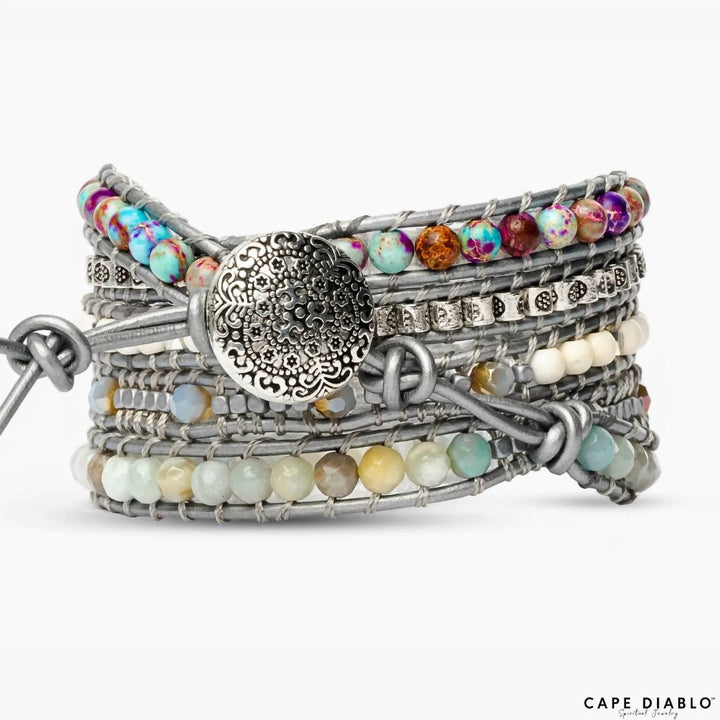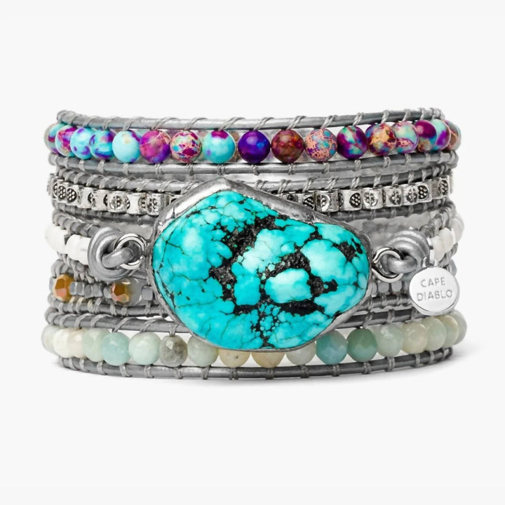 This Women’s Healing Turquoise Protection Wrap Bracelet in Silver by Cape Diablo is a beautiful blend of natural stones and genuine leather. Featuring turquoise, Imperial Jasper, and Amazonite stones, this bracelet offers a calming and protective energy. The adjustable length and three closures make it versatile and comfortable, perfect for adding a touch of tranquility to any outfit.