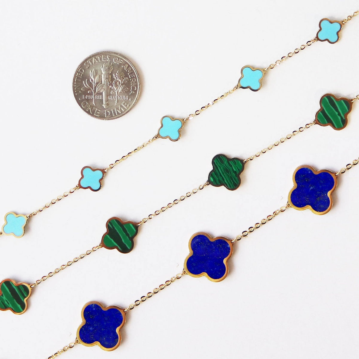 Made of 14K yellow gold with 7 large lapis clovers, each measuring 14mm (0.55 inches). Adjustable chain length from 15.5' to 17.5', secured with a lobster clasp.