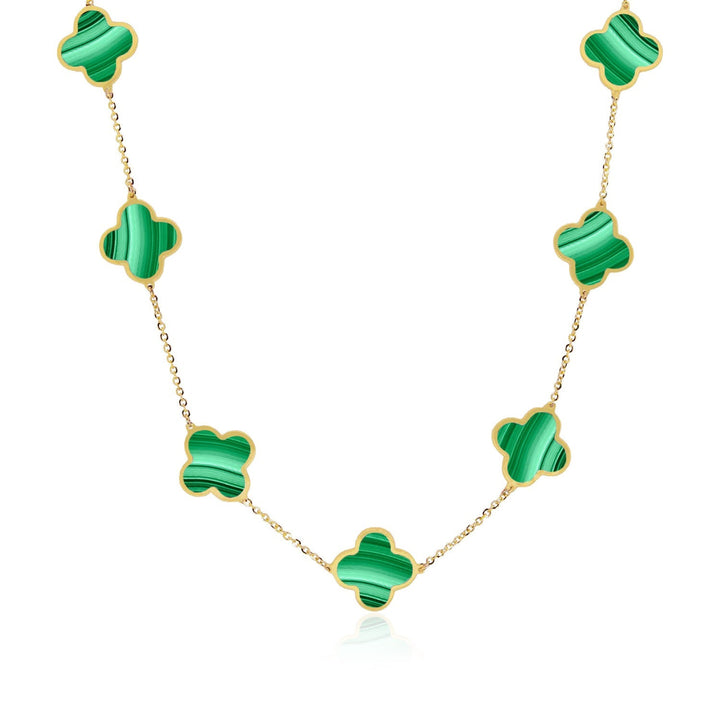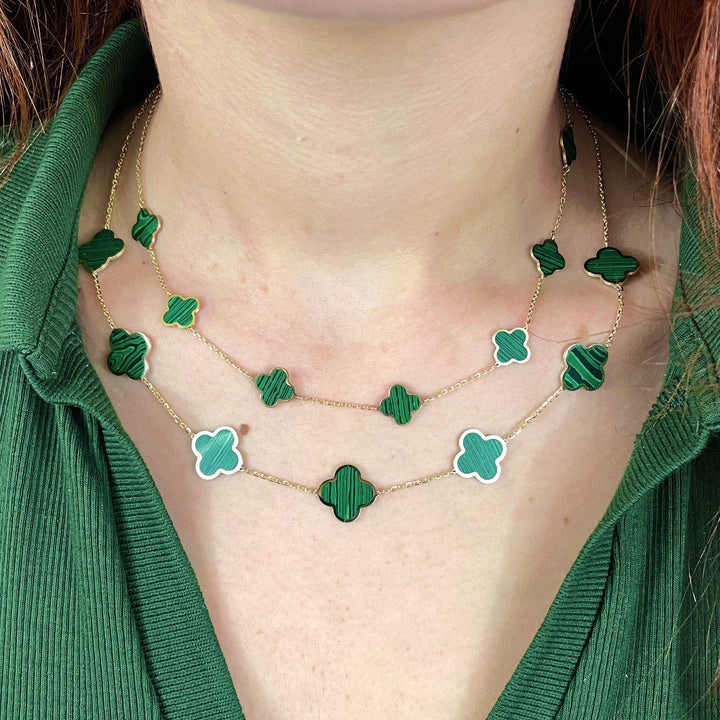 Made of 14K yellow gold with 7 large malachite clovers, each measuring 14mm (0.55 inches). Adjustable chain length from 15.5' to 17.5', secured with a lobster clasp.