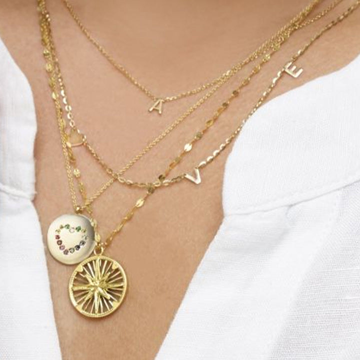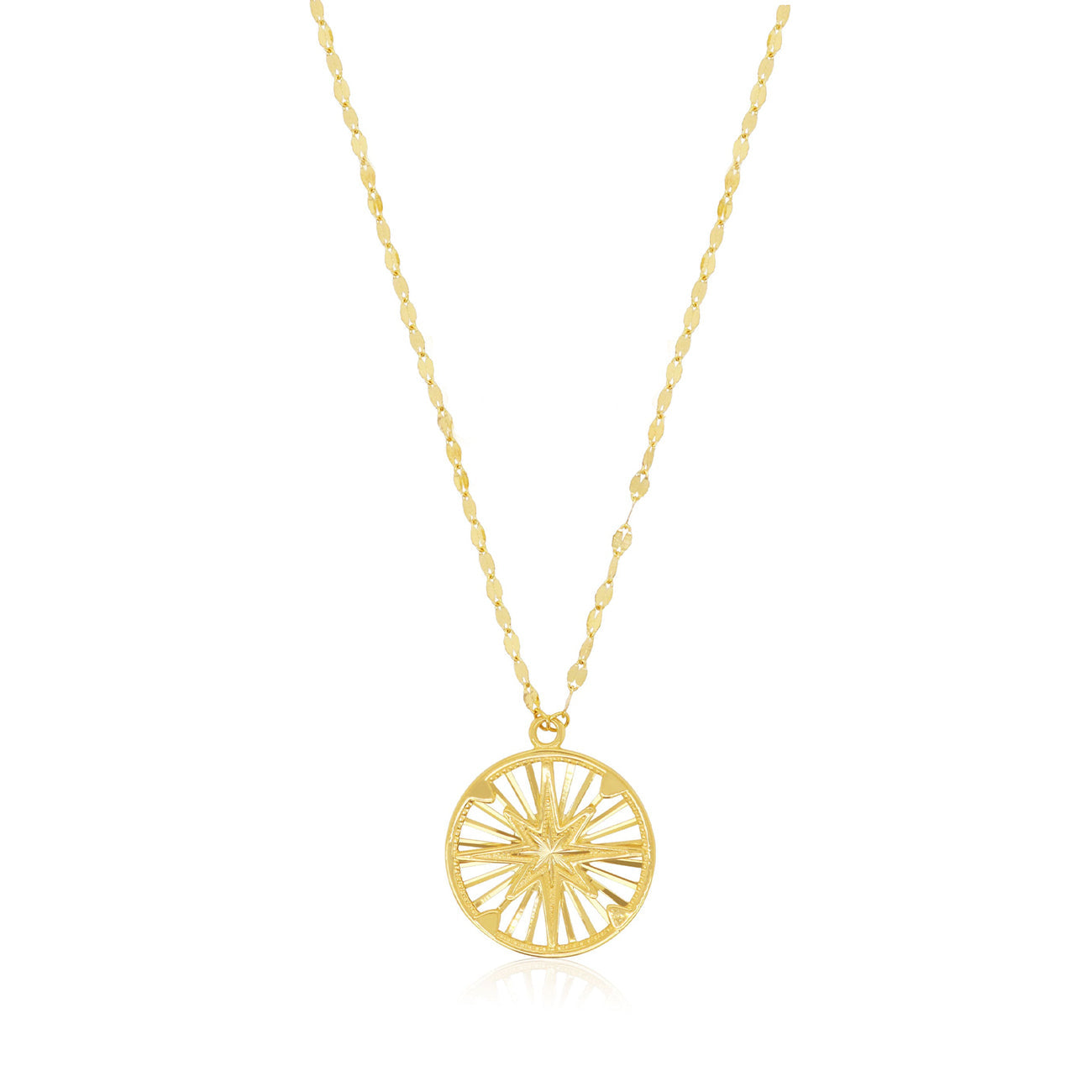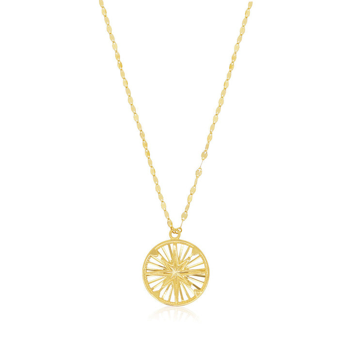 This Gold Compass Medallion Necklace by The Lovery is a symbolic and stylish piece for those who seek adventure. The 14K yellow gold medallion features a compass design, making it the perfect accessory for navigating life’s journey.