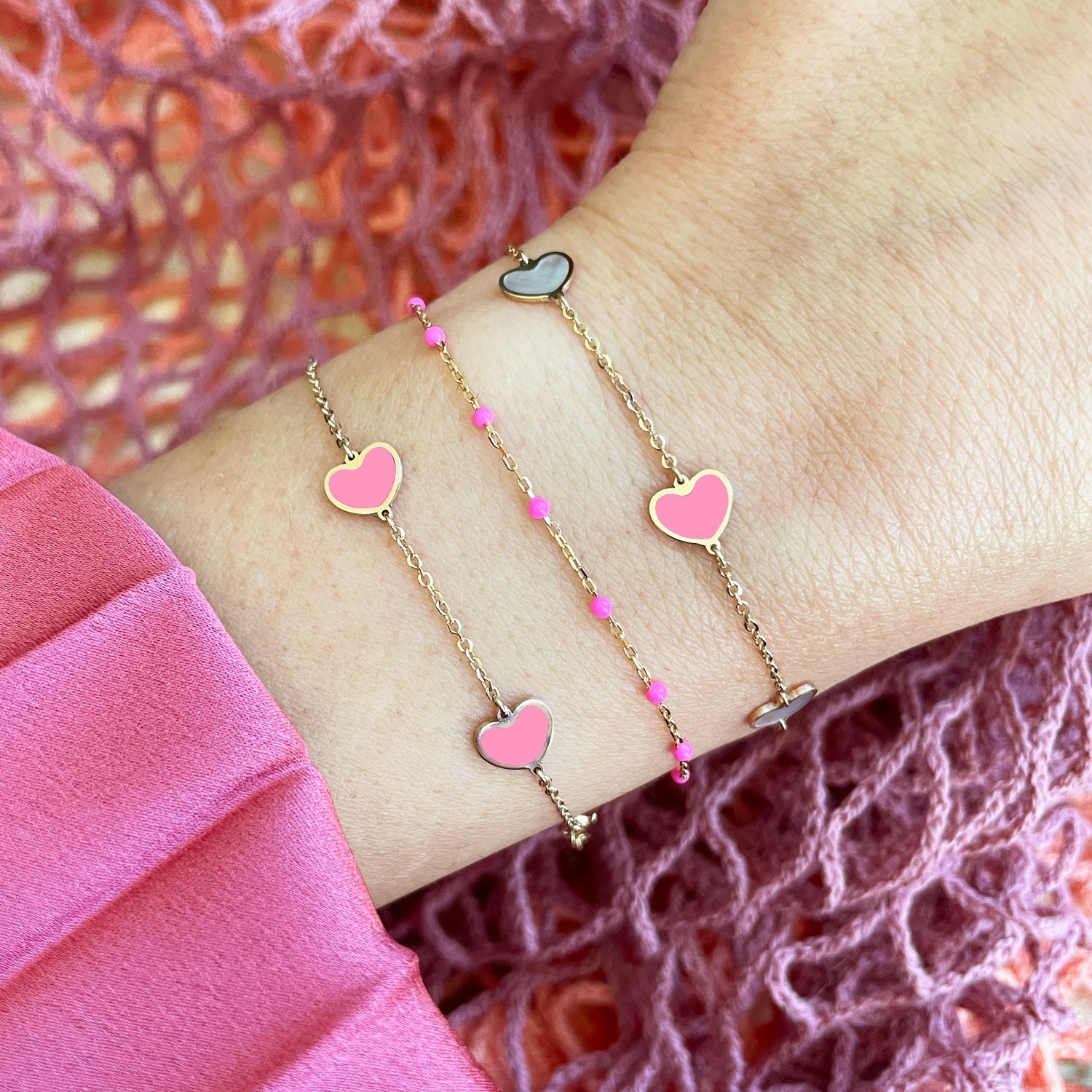 This Bubblegum Pink Heart Station Bracelet by The Lovery features 5 bubblegum pink hearts set in 14k yellow gold. The hearts, each measuring 7mm, add a playful and sweet touch to your arm party. The adjustable chain allows for a comfortable fit.