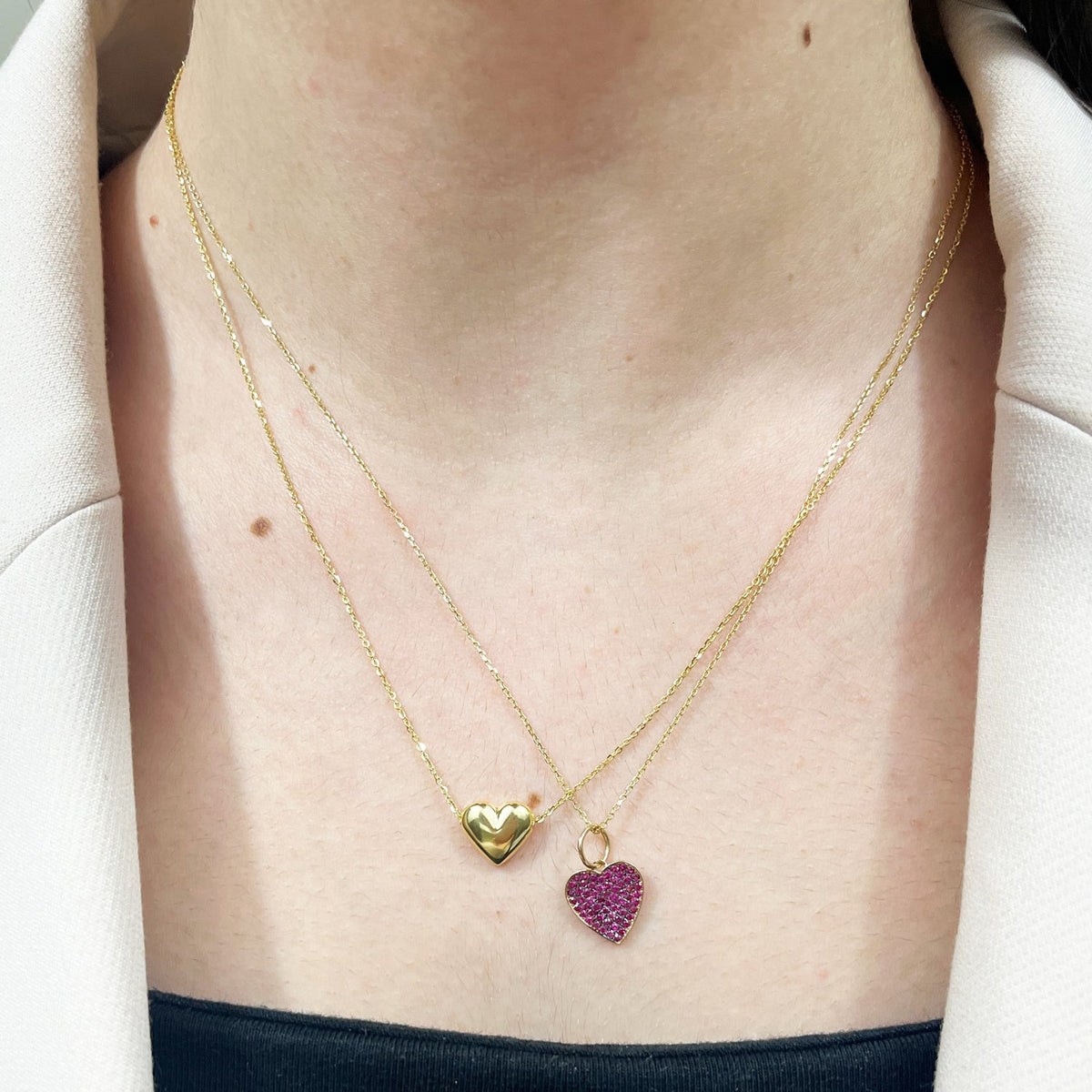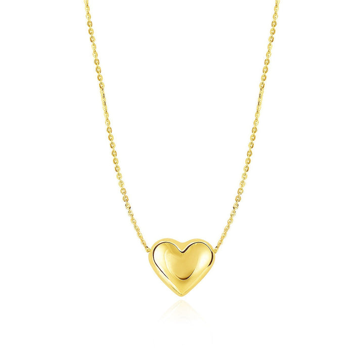 Crafted in 14K yellow gold, featuring a gold puffy heart pendant. Heart size: 9 x 10mm. Necklace length: 18'. Spring ring clasp.