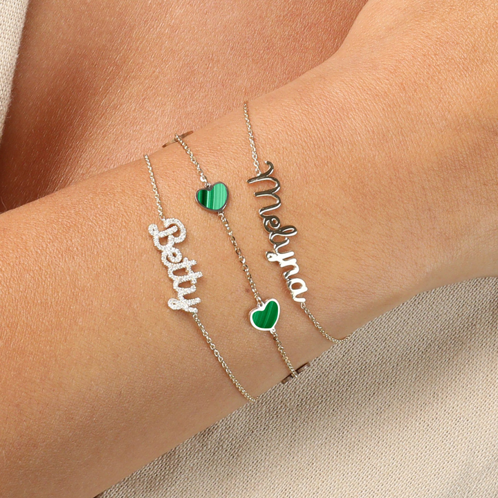 This Malachite Heart Station Bracelet by The Lovery features 5 malachite hearts set in 14k yellow gold. Perfect for heart-lovers, this bracelet can be worn on its own or stacked with other pieces for a stylish, heartwarming look.