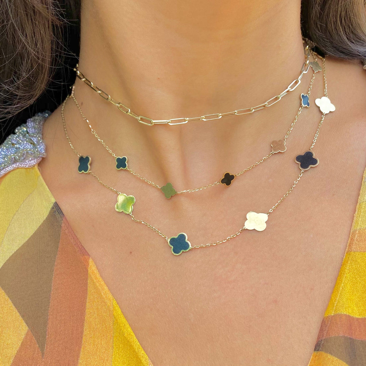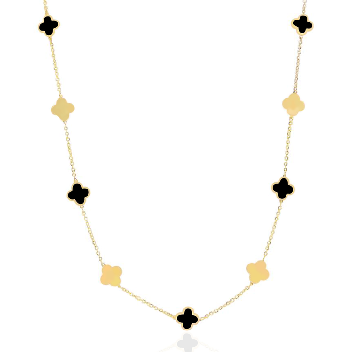 Made of 14K yellow gold with 5 onyx clovers, each measuring 7mm (0.25 inches). Adjustable chain length from 16' to 18', secured with a lobster clasp.