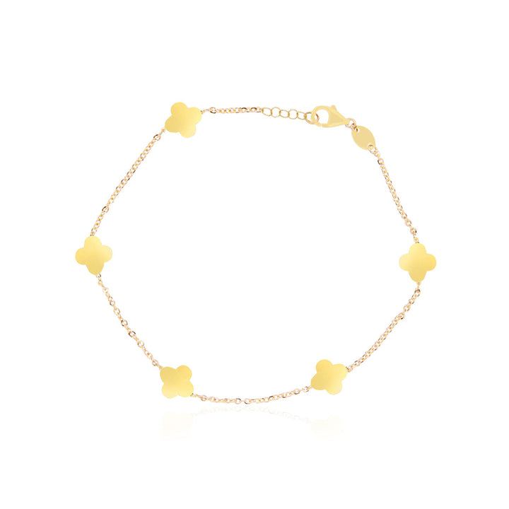 Made with 14K yellow gold and five gold clovers. Each clover measures 7mm (0.25 inches). Chain length: 6.5-7 inches. Lobster clasp closure.