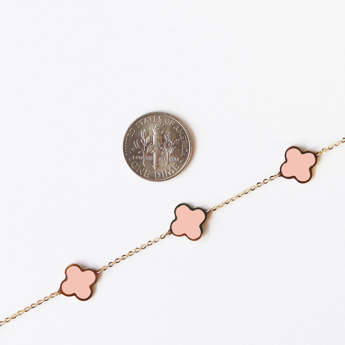 Made with 14K yellow gold and 5 pink pearl clovers. Each clover measures 10 mm (0.40 inch). Chain length: 7 inches. Lobster clasp closure.