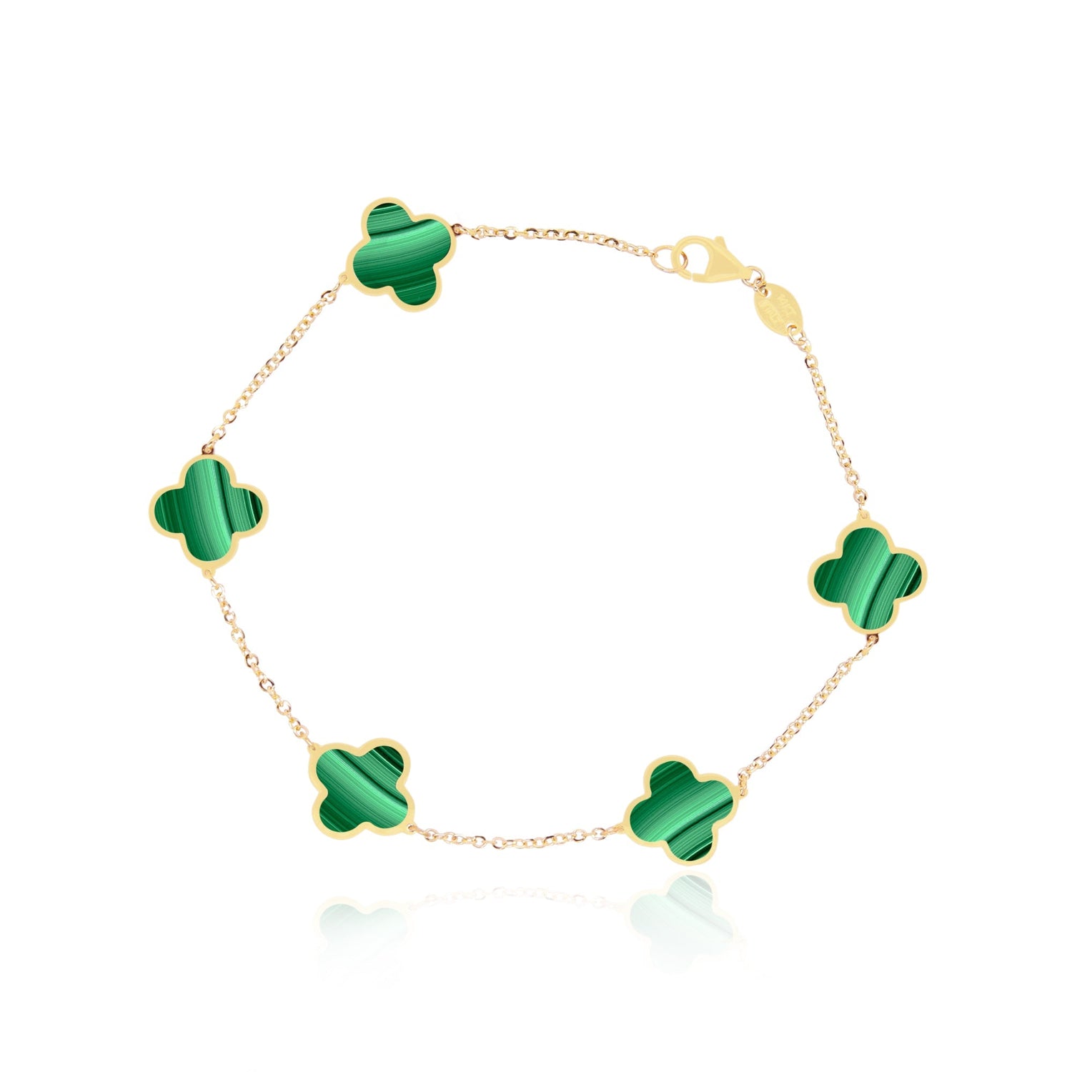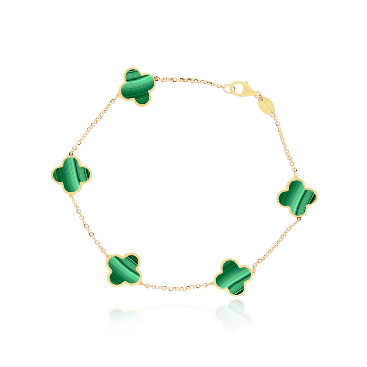 Made with 14K yellow gold and 5 malachite clovers. Each clover measures 10 mm (0.40 inch). Chain length: 7 inches. Lobster clasp closure.