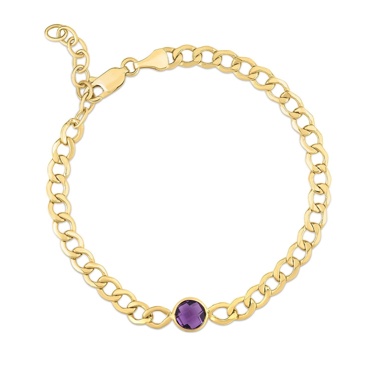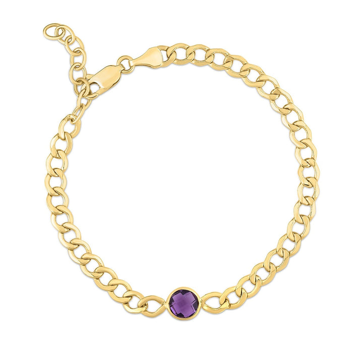 Handcrafted in 14k yellow gold, featuring 1 round amethyst, adjustable chain length from 6 to 7 inches, with a lobster clasp.