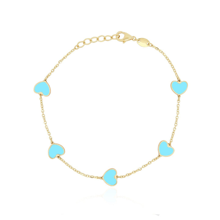 Handcrafted in 14k yellow gold, featuring 5 turquoise hearts (7mm each), adjustable chain length from 6.5 to 7 inches with a lobster clasp.