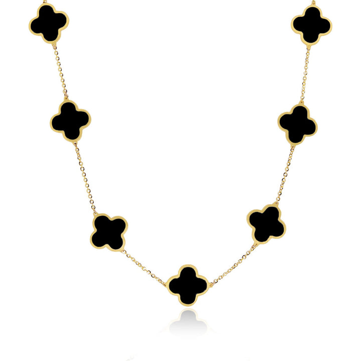 Made of 14K yellow gold with 7 large onyx clovers, each measuring 14mm (0.55 inches). Adjustable chain length from 15.5' to 17.5', secured with a lobster clasp.