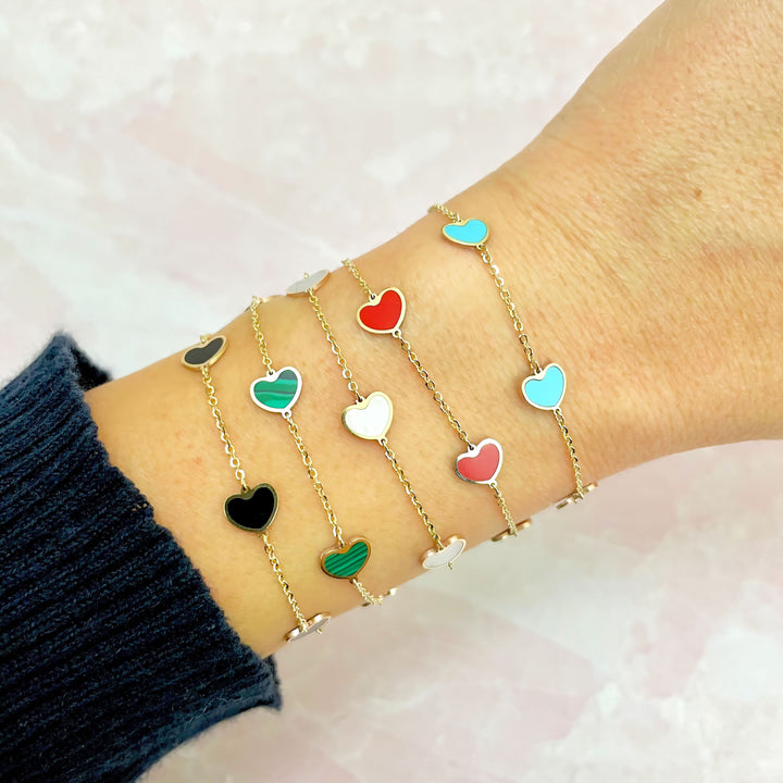 This Mother of Pearl Heart Station Bracelet by The Lovery is a perfect choice for heart-lovers. Featuring 5 mother of pearl hearts, this bracelet is delicate yet bold, ideal for wearing solo or stacked with other bracelets.
