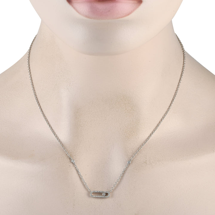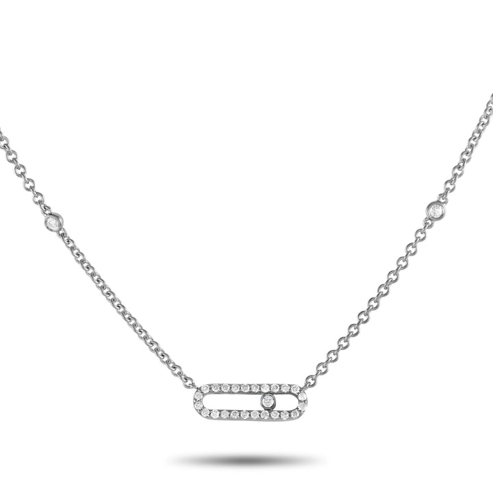 Crafted from 18K white gold, the necklace features two bezel-set round diamonds (0.25ct total weight). The pendant measures 0.65' long and 0.15' wide, with a paperclip-style design.