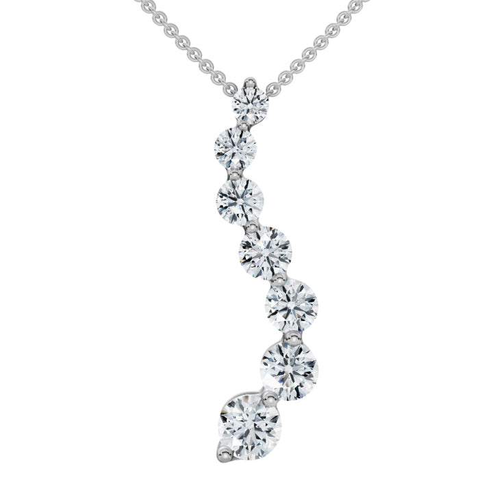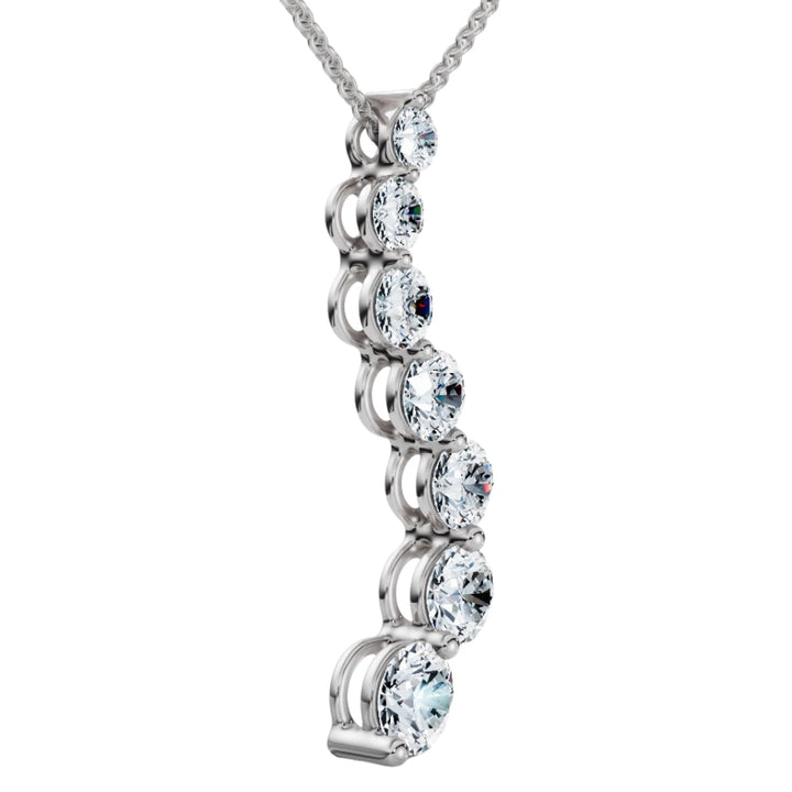 This F/VS 3ct Diamond Journey Pendant Gold Women's Necklace Lab Grown by Pompeii3 features seven graduated round brilliant cut lab-grown diamonds, each prong-set in solid gold. The design symbolizes growth and progression, making it a meaningful piece for anyone who celebrates their journey. The pendant’s polished gold setting complements the diamonds, making it a beautiful statement piece.
