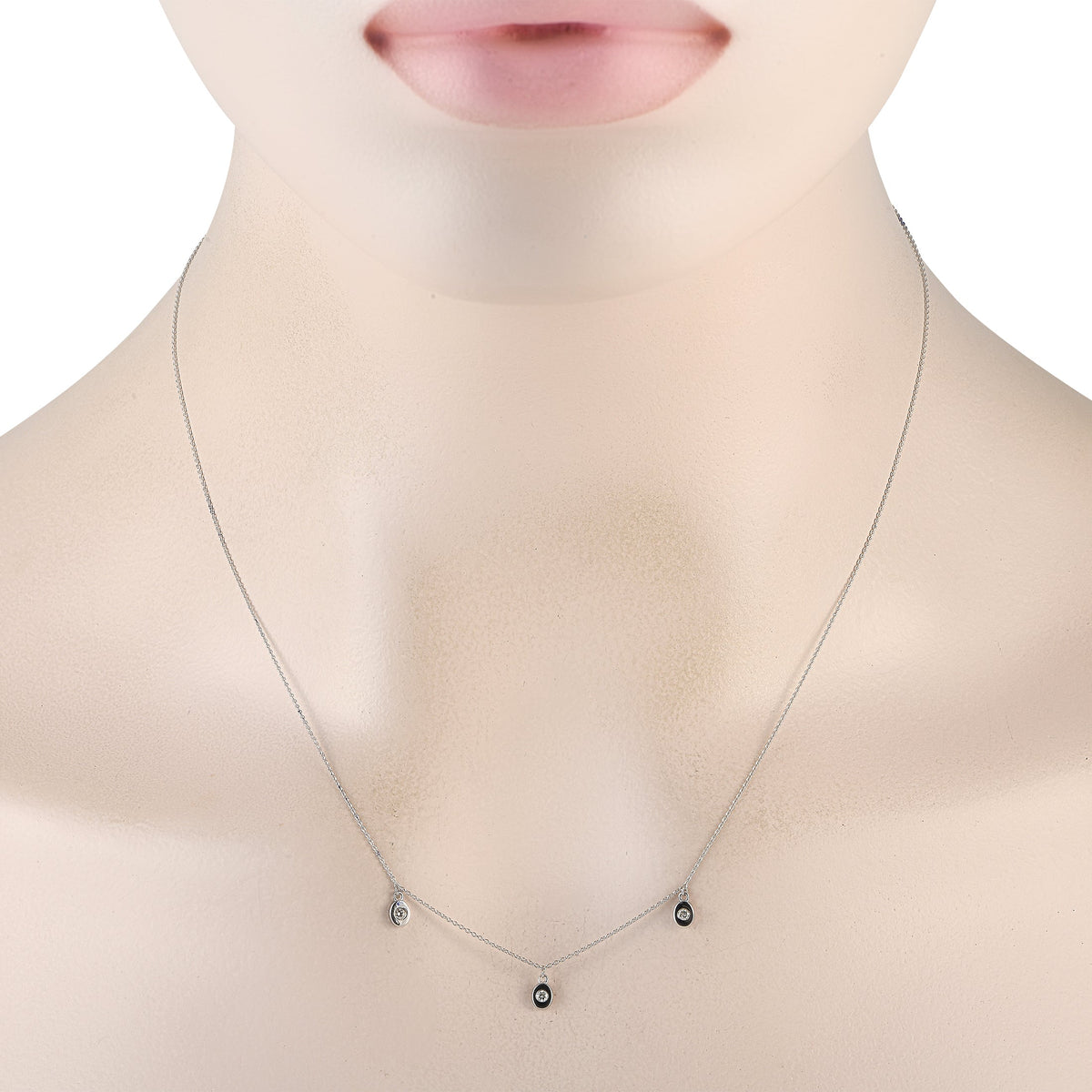 This LB Exclusive 14K White Gold 0.06ct Diamond Station Necklace by LB Exclusive is a classic design featuring three 14K white gold pendants. The round-cut diamonds, totaling 0.06 carats, add a subtle touch of sparkle, making this necklace perfect for everyday wear. The necklace features an 18-inch chain with a lobster clasp.