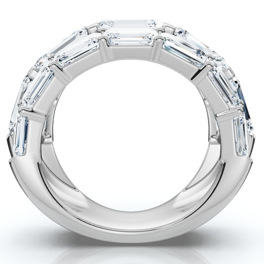 Crafted in 14K White Gold, this wide fashion ring features 9.70ct of emerald-cut lab-grown diamonds, prong-set east to west. The diamonds are VS clarity and F-G color. Available in size selectable options.