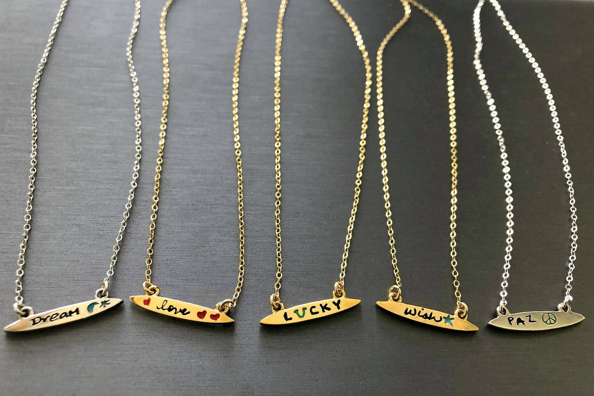 This Women's Enamel Small Surfboard Necklace - Dream in Silver by Jessica Elliot features hand-enameled details, making it a vibrant yet versatile necklace for everyday wear.