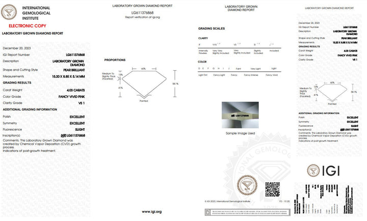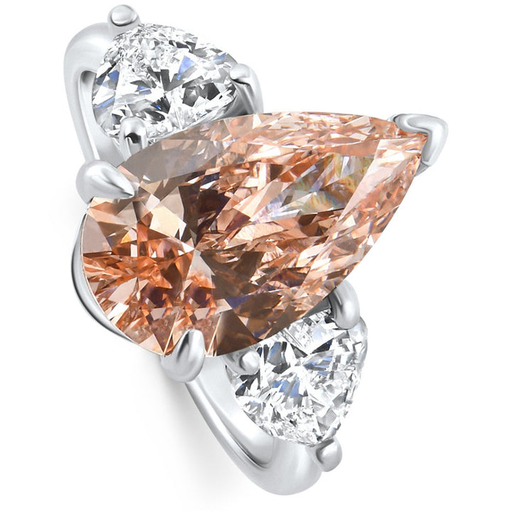 Handcrafted in 14k white gold, featuring a 4.03 ct pear-shaped fancy vivid pink diamond with two heart-shaped accent diamonds. Prong setting. Polished finish. IGI certified.