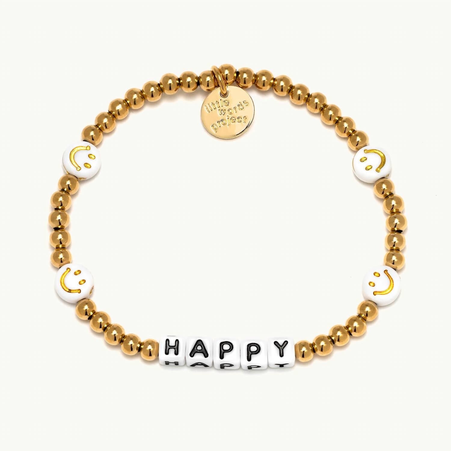 This Women's Happy Bracelet in White/Gold by Little Words Project is a fun, handcrafted piece that adds a touch of happiness to your collection. Featuring crystal beads and plated brass hardware, this elastic stretch bracelet can be worn solo or stacked with others for a bold, joyful look.