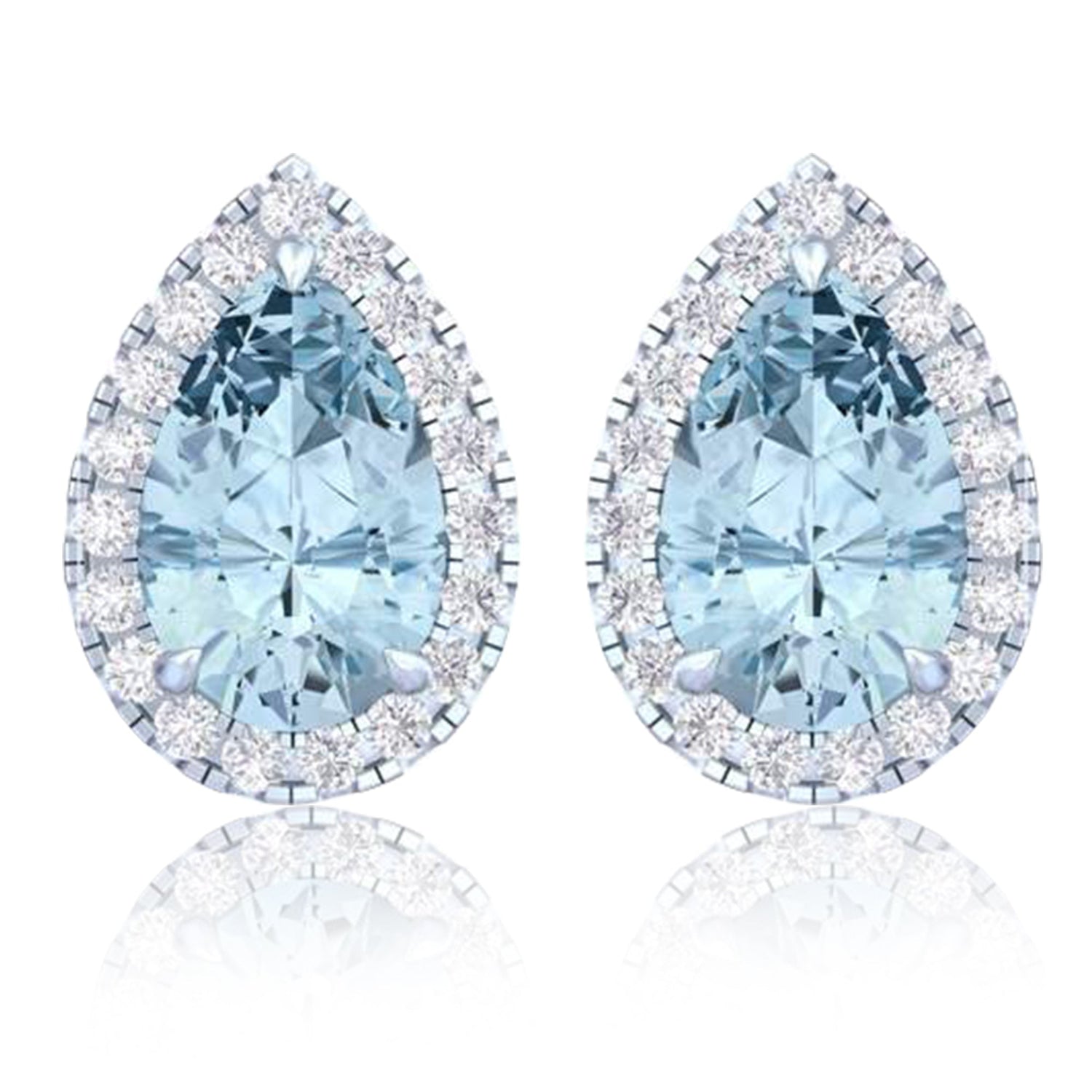 These 14K White Gold Vivid Blue Pear Cut 4.7 CT Lab-Grown Diamond Halo Stud Earrings by Diamond2Deal feature stunning sky blue diamonds encircled by a halo of brilliant diamonds. The VVS clarity of the diamonds ensures a captivating sparkle.