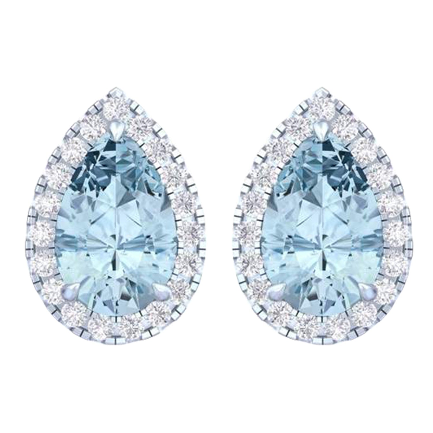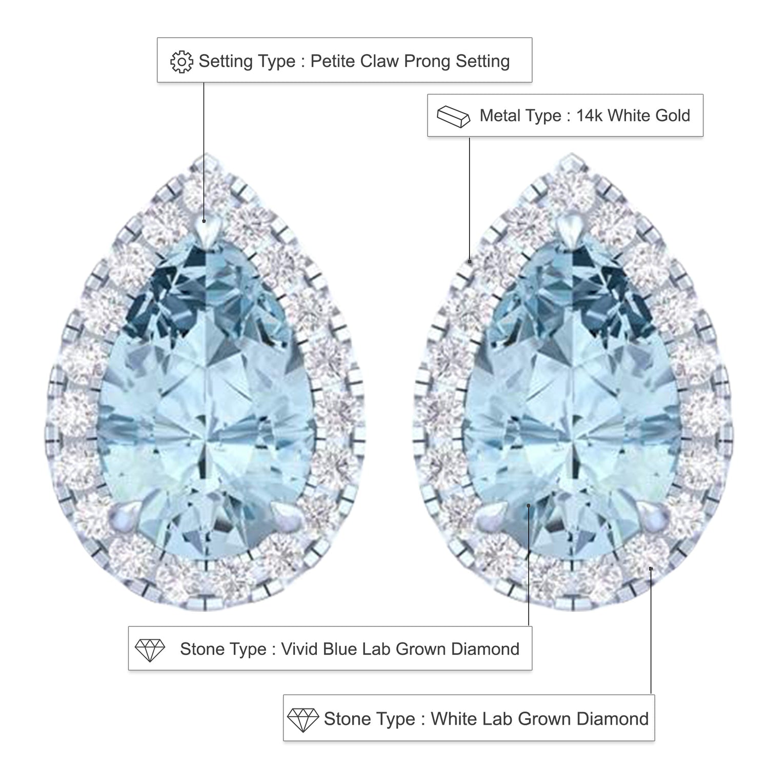 14k White Gold Vivid Blue Pear Cut 4.7 CT Lab-grown Diamond Halo Stud Earrings