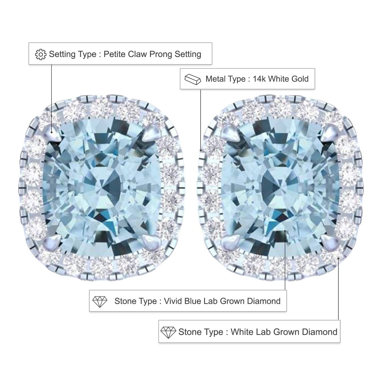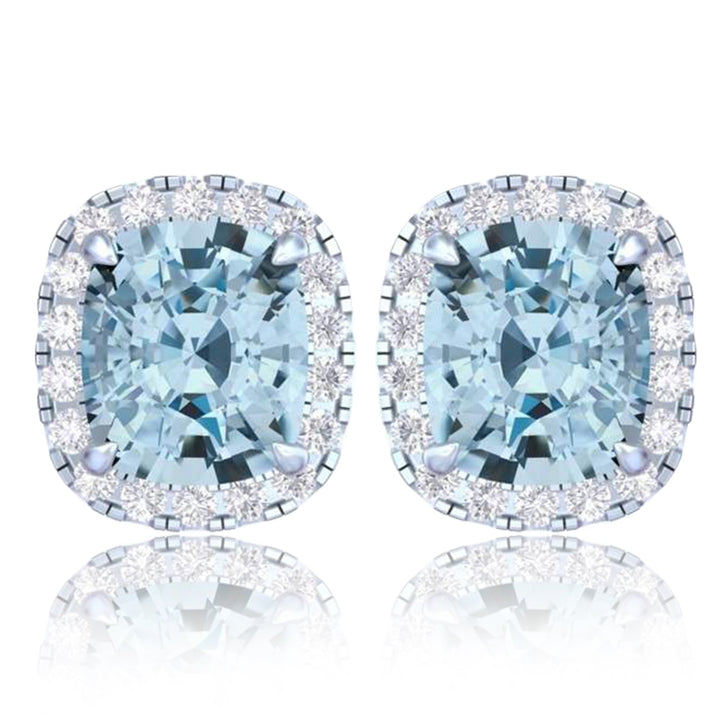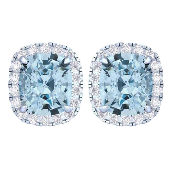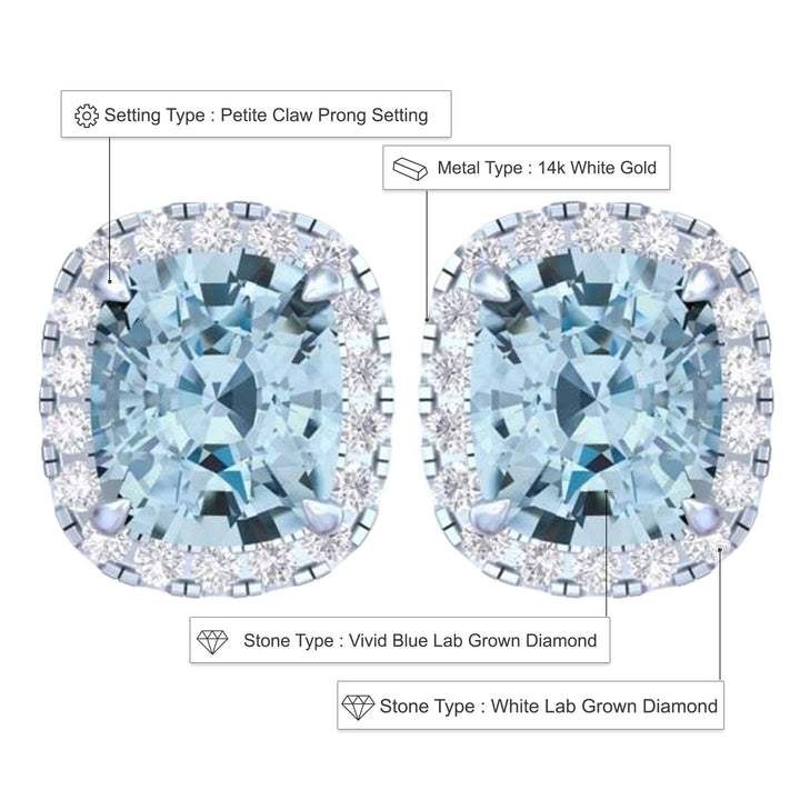 14k White Gold Vivid Blue Cushion Cut 5.5 CT Lab-grown Diamond Halo Stud Earrings