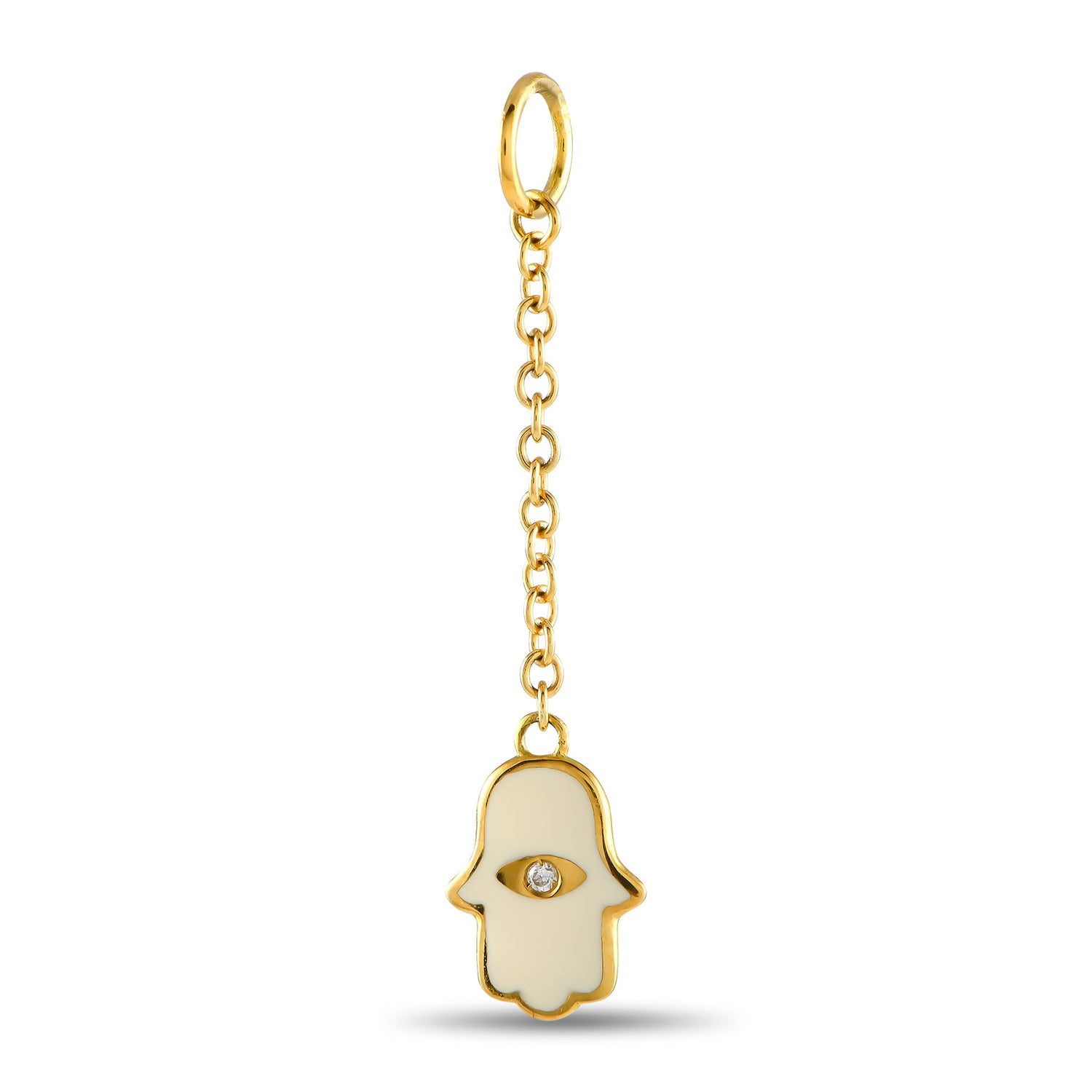This Aaron Basha 18K Yellow Gold Diamond and Enamel Hamsa Charm Pendant is a beautiful symbol of positivity and protection. The Hamsa hand, set in 18K yellow gold with white enamel, is accented with a diamond in the center, adding a luxurious touch. This charm is perfect for anyone who values both beauty and meaning in their jewelry.