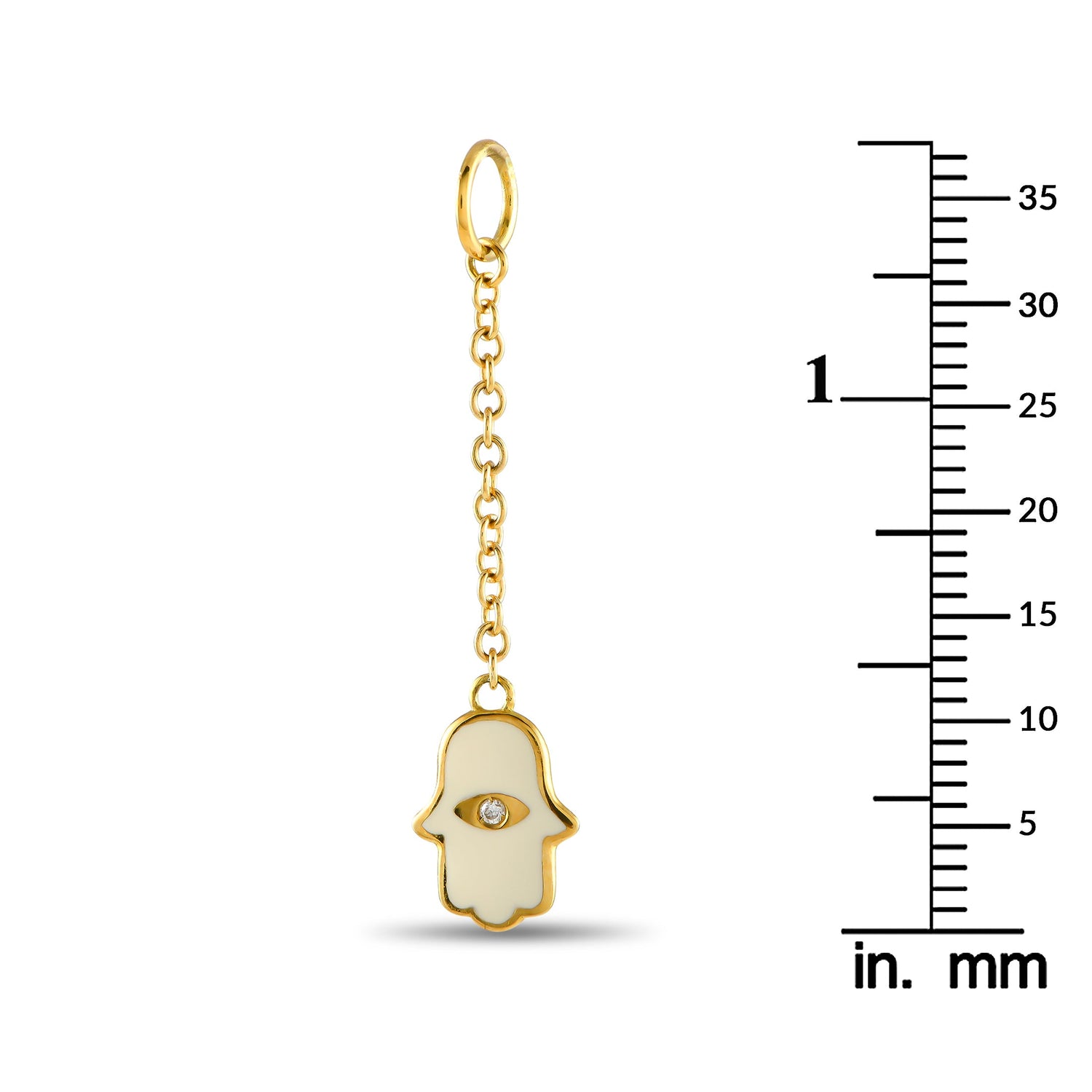 Made from 18K yellow gold with white enamel and a diamond center. The pendant measures 1.50 inches long by 0.45 inches wide and weighs 2.0 grams.