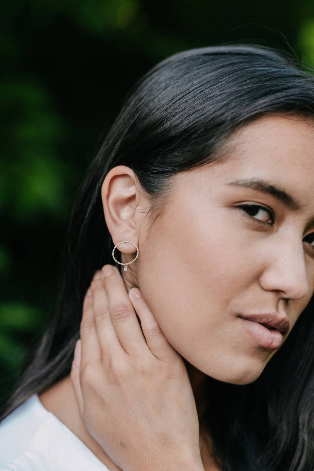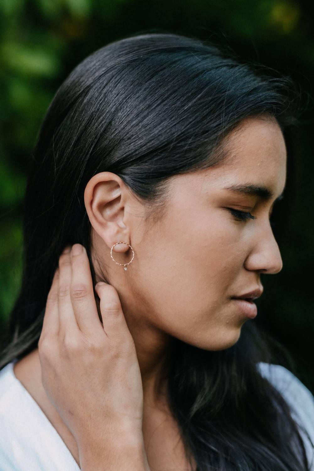 Handcrafted in 14K white gold with a 2mm diamond bezel. Post back. Made in the USA.