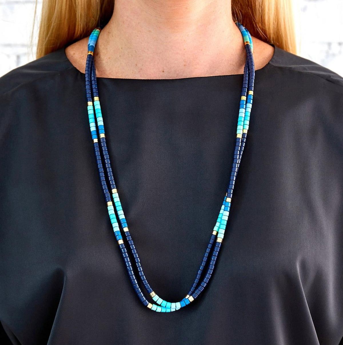This Laguna Necklace in Ocean by Caryn Lawn is a statement piece that adds a fun pop of color to any outfit. Made with enamel and designed to be worn long, this 30-inch necklace is perfect for a modern, artistic look. Whether paired with a simple white tee or a dressier ensemble, this necklace is a versatile addition to your collection.